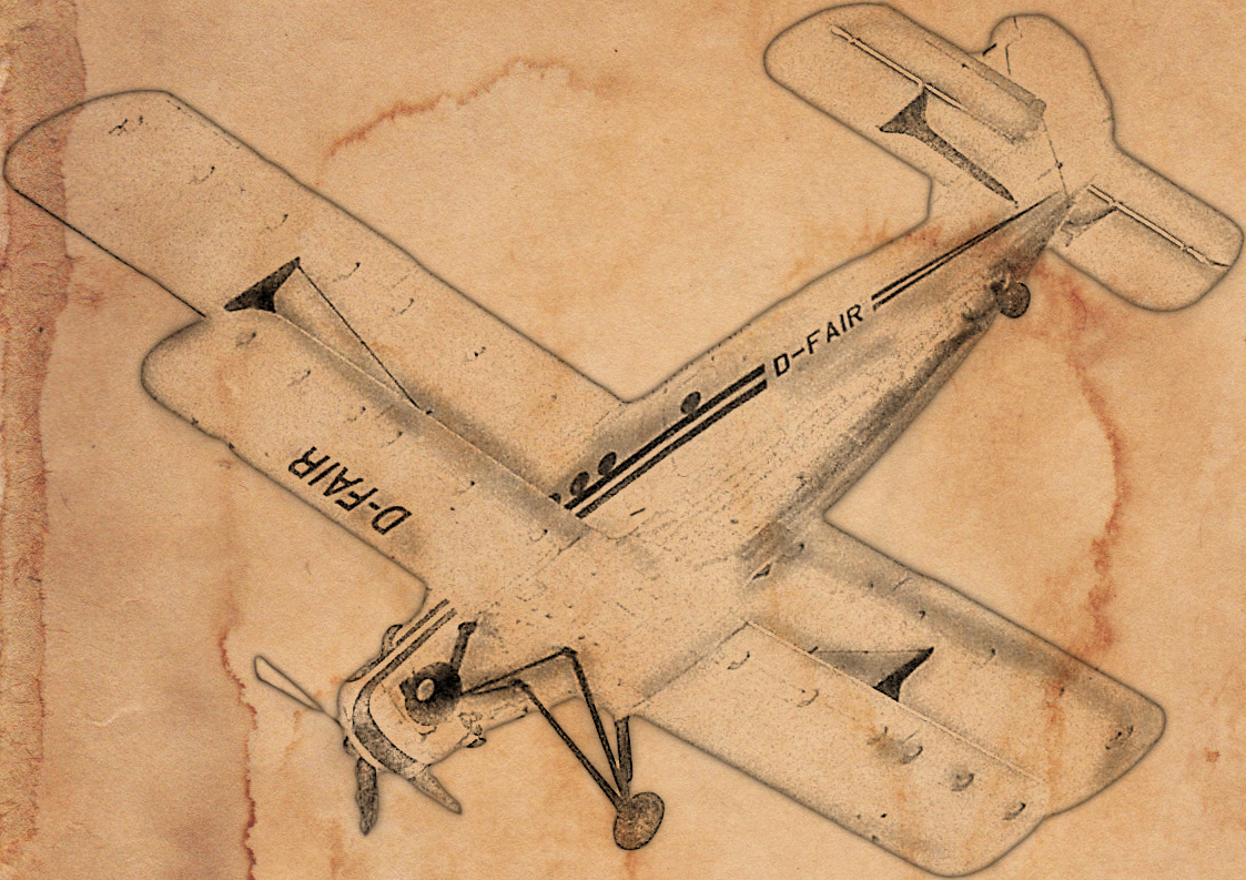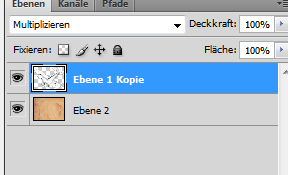 Damit ist der Hauptschritt hin zu einer Bleistiftzeichnung getan. Da das Bild so ein wenig einsam wirkt, habe ich in den Hintergrund eine veraltete Papiertextur eingefügt. Natürlich kann man die Bleistiftzeichnung bereits an dieser Stelle für seine eigene Zwecke je nach Bedarf nutzen. Ansonsten wird die neue eingefügte Papiertetxtur-Ebene unter die Flugzeug-Ebene gezogen, damit das Motiv selber sichtbar bleibt. Die beiden Flugzeugebenen werden ausgewählt und über das Kontextmenü „Auf eine Ebene reudzieren“ reduziert. Als Farbmodus habe ich „Multiplizieren“ eingestellt:
