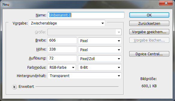Wichtig ist dabei den Hintergrundinhalt auf Transparent zu stellen. Einen Namen kann jeder selbst vergeben. Die Größe richtet sich nach dem Bild aus der Auswahl.