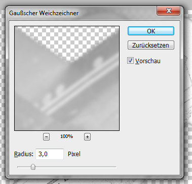 Jetzt kommt der Gaußsche Weichzeichner zum Einsatz, welcher sich im Menü unter Filter -> Weichzeichnungsfilter -> Gaußscher Weichzeichner befindet. Die Einstellungen werden dabei wie im Screenshot dargestellt vorgenommen: