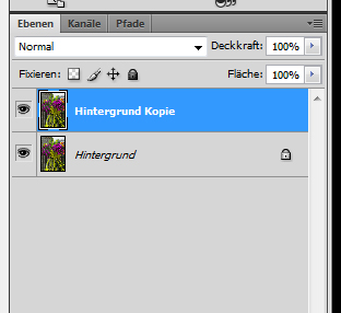 Im nächsten Schritt wird Hintergrundebene dupliziert. Dazu macht man einen Rechtsklick auf Hintergrundebene und wählt im erscheinenden Kontextmenü den Punkt Ebene duplizieren aus. Das Ebenenmenü sieht dann wie folgt aus: