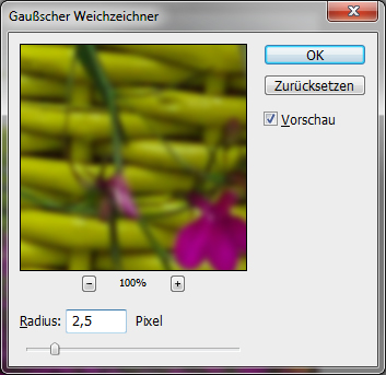 Auf die Ebene „Hintergrund Kopie“ wird über den Menüpunkt Filter jetzt der Weichzeichnungsfilter -> Gaußscher Weichzeichner angewendet. Dabei habe ich die Einstellungen wie in dem nachstehenden Screenshot vorgenommen, wobei die individuellen Einstellungen ebenso von der Auflösung des Fotos abhängen: