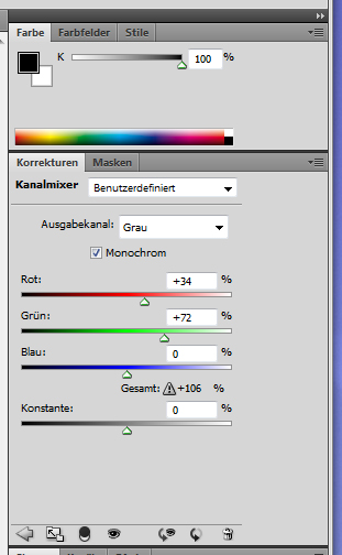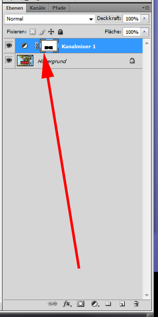 Dann wird unter den Korrekturen der Kanalmixer ausgewählt, welche als neue Einstellungsebene im Ebenen-Menü hinzugefügt wird: