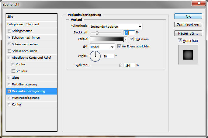 Im letzten Schritt wird ein weiterer Ebenenstil hinzugefügt, dies mal wird jedoch über Ebenstil hinzufügen -> Verlaufsüberlagerung ausgewählt. Die Einstellungen hierfür können dem nachstehenden Screenshot entnommen werden: