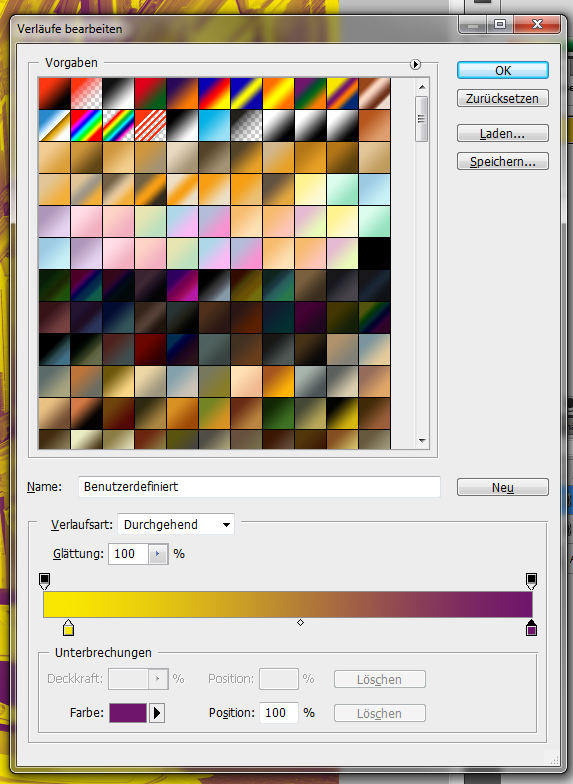 Um den Verlauf anzupassen, wird auf diesen einmal ein Doppelklick ausgeführt. Die Einstellungen können dem nachstehenden Screenshot übernommen werden. Wie man sieht habe ich hier einen Verlauf von gelb nach lila ausgewählt: