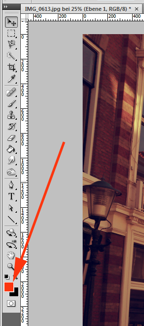 Im nächsten Schritt wird dem Bild so zu sagen ein störender Lichteefekt hinzugefügt, wie er oft durch alte Kameras erzeugt wurde. Dazu stellt man die Vordergundfarbe auf ein helles rot ein. Ich habe dazu den den Farbcode #f29988 verwendet. Zur Einstellung des Farbfeldes führt man ein Doppeklick auf dieses aus: