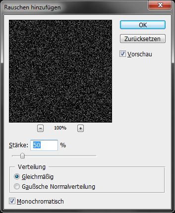 Zum Schluss wird schließlich noch ein körniger Effekt dem Bild hinzugefügt, um das Bild zusätzlich veraltet wirken zu lassen. Dazu wird über den vorherigen Ebenen eine weitere neue Ebene erstellt. Diese wird diesmal mit schwarz gefüllt. Anschließend wird über Filter -> Rauschen -> Rauschen hinzufügen die Ebene gekörnt. Die Einstellungen werden dabei wie nachstehend vorgenommen: