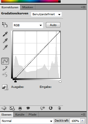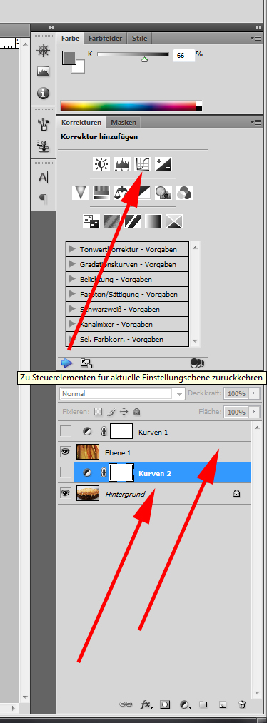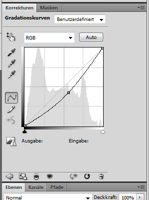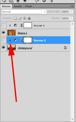 Um die Einstellungen zu optimieren kann man nun noch die Gradationskurven anpassen für die einzelnen Ebenen. Dazu wählt man zunächst zwei mal die Gradationskurven unter Korrekturen aus und ordnet sie jeweils über den einzelnen Bildebenen an: